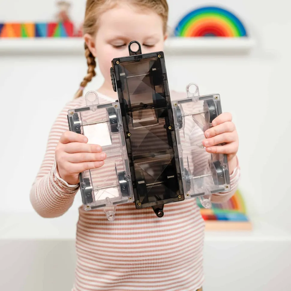 Mooie set om vrachtwagens, auto’s, treinen en vliegtuigen te bouwen. Dankzij de stevige basissen met rubberen wielen die in het pakket zitten, kunnen er snel mooie creaties ontstaan.