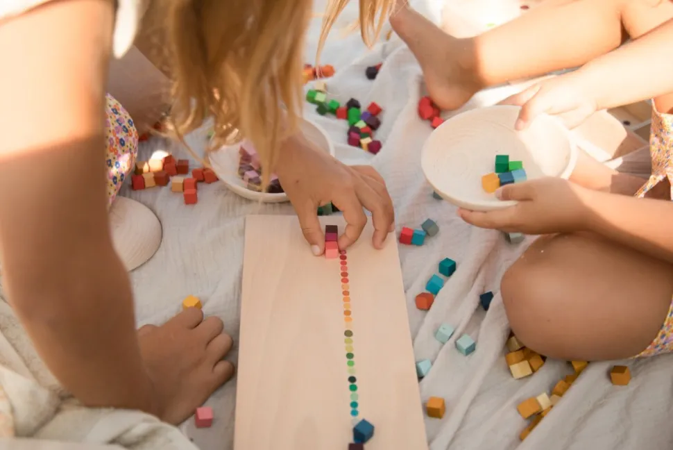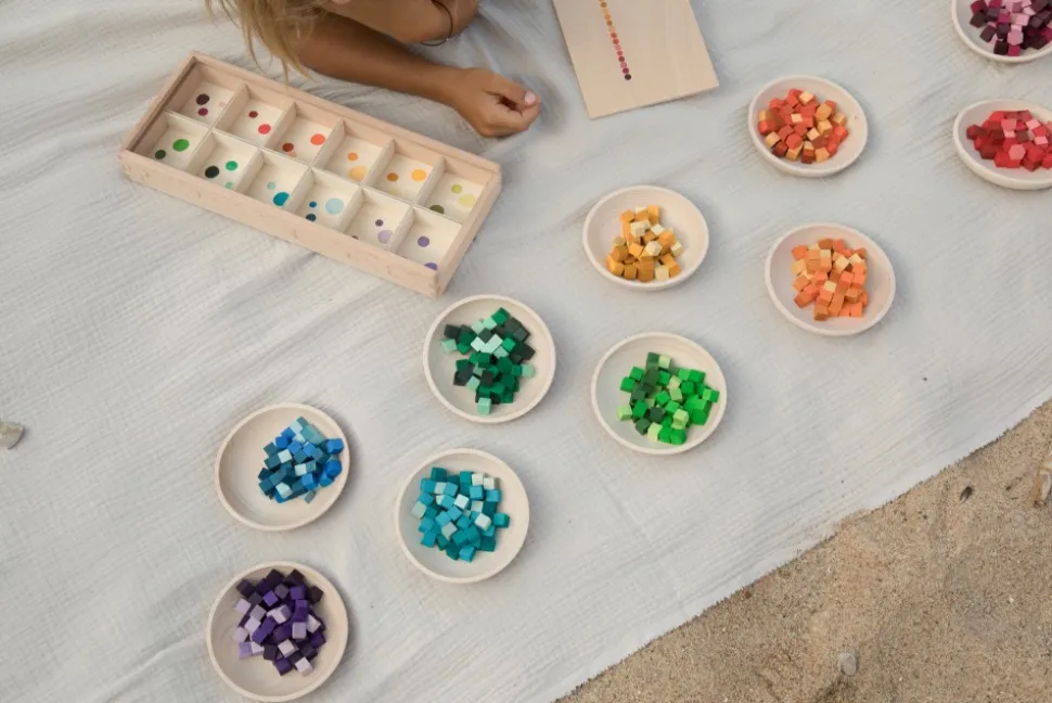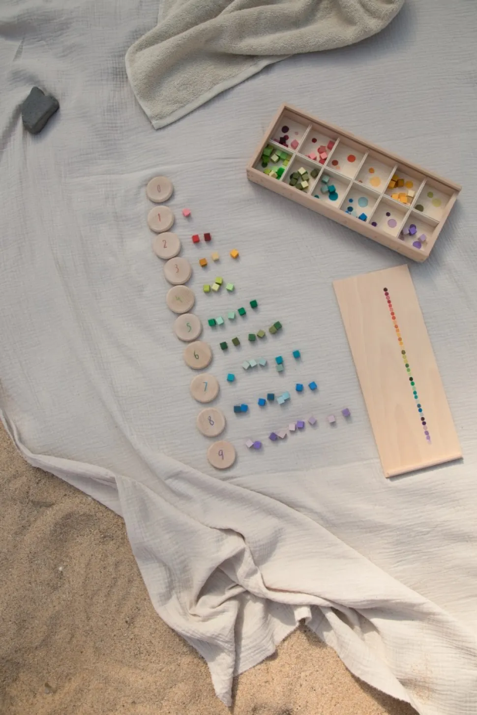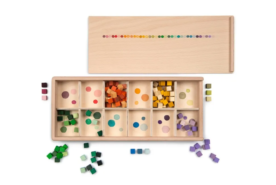 Mooie handbeschilderde sorteerdoos met meer dan 400 gekleurde blokjes in de kleuren van de regenboog in verschillende kleurtinten.