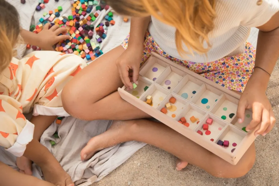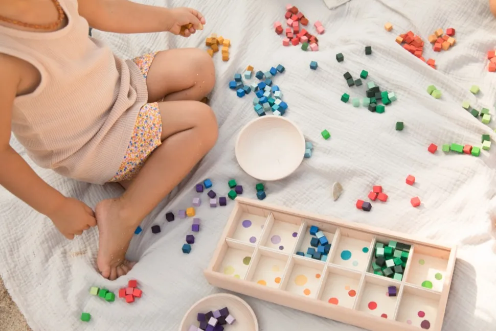 De blokjes kunnen op verschillende manieren gebruikt worden: sorteren, tellen, rekenen, open einde spel etc…
