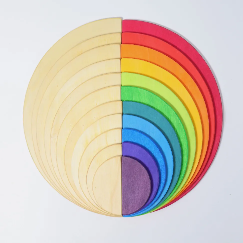 Deze halve cirkels kunnen heel goed gebruikt worden in bouwwerken met blokken, maar zijn natuurlijk helemaal leuk om te gebruiken in combinatie met de Grimm’s regenboog en bouwplaten. Je maakt er bijvoorbeeld de mooiste ball runs mee!