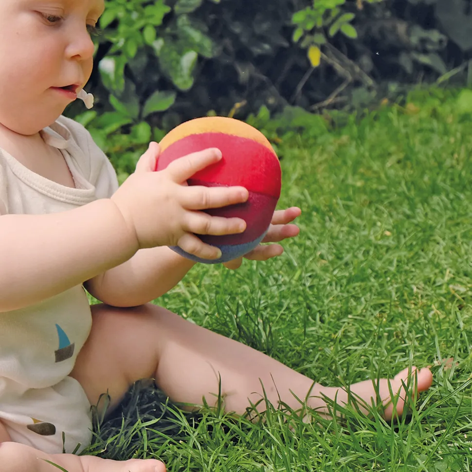 Fijn formaat stoffen bal voor de allerkleinsten. Als je de bal heen en weer schudt, hoor je een zacht geluidje. Door de mooie kleuren zijn kinderen dol op deze fluweelzachte bal. Moedigt aan tot er achter aan kruipen en lopen.
