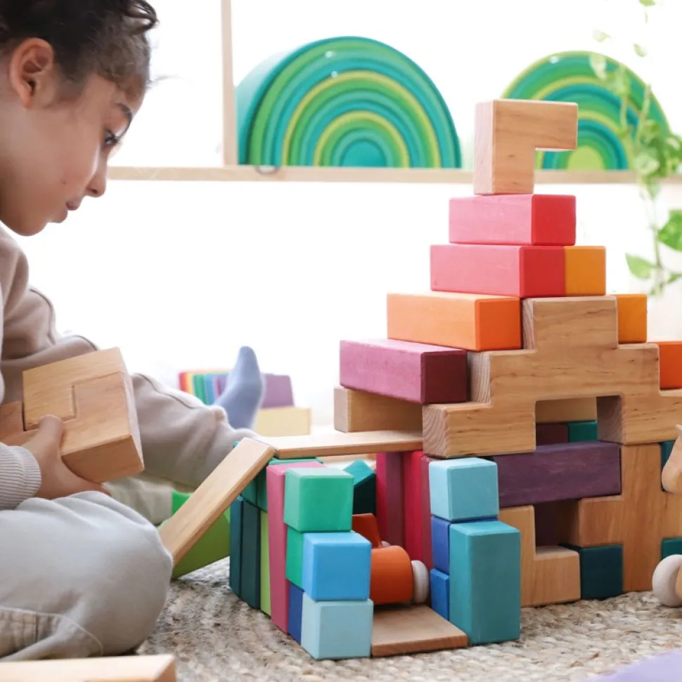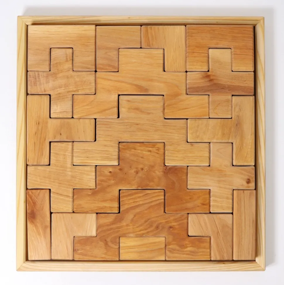 Geweldige blokkenset van 19 ’trap’, ‘kruis’, ‘T’ en ‘L’- vormige blokken. Deze set combineert perfect met de Grimm’s grote piramde.