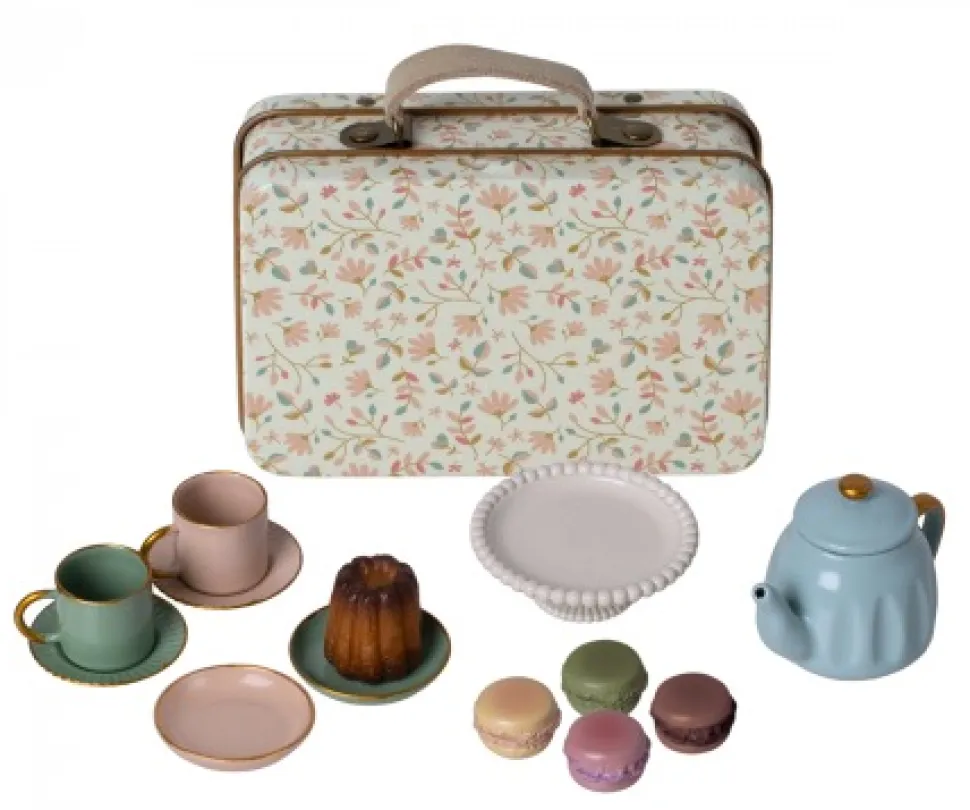 Mooi metalen koffertje vol met het prachtigste thee servies en de lekkerste lekkernijen voor de muisjes.