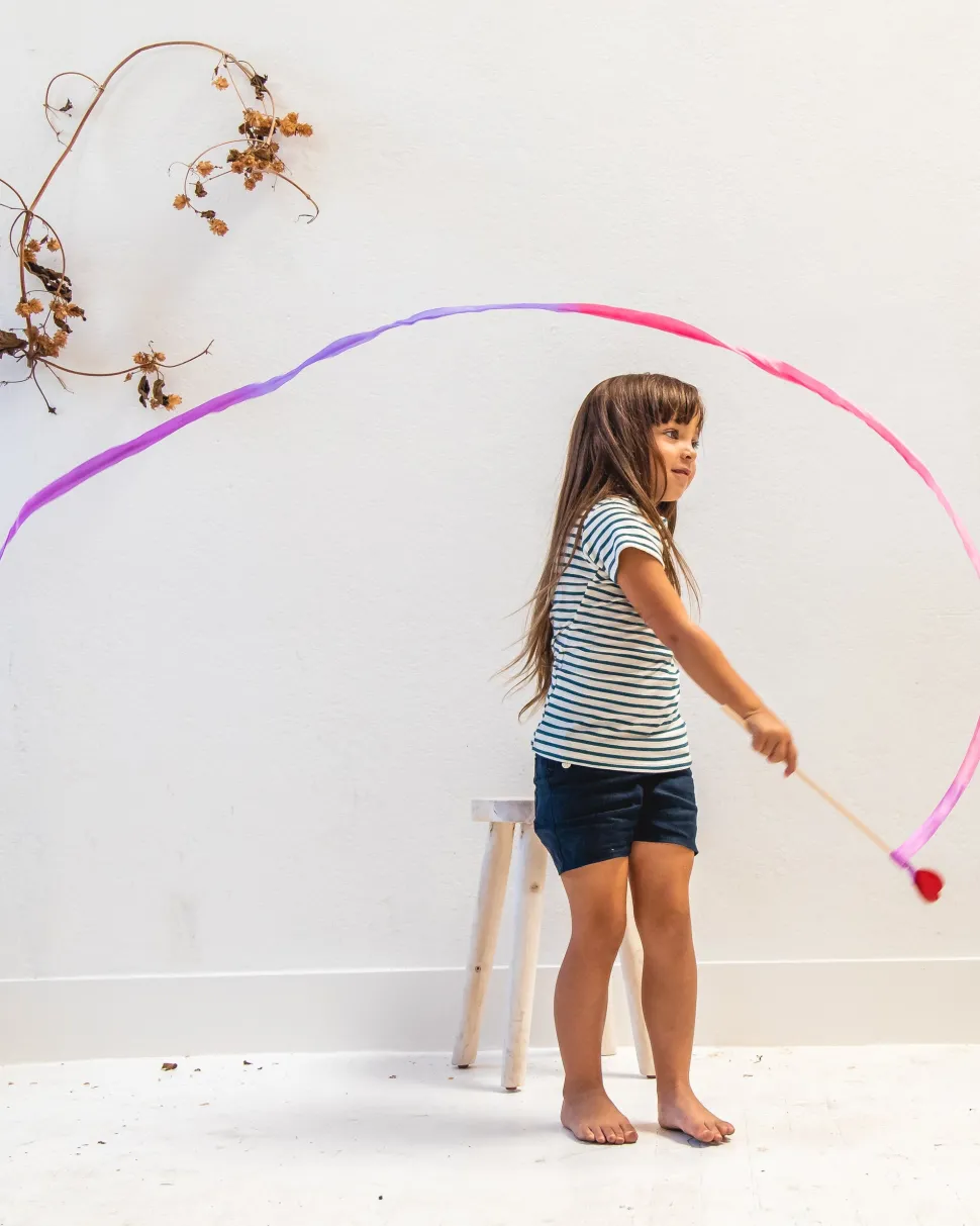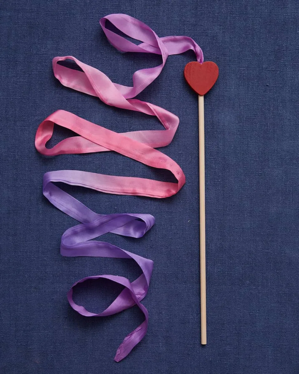 Houten staf met een hart bovenop en een mooi en lang kleurig lint er aan. Perfect om te gebruiken bij dans of vrij spel. Leuke aanvulling op de verkleedkist.