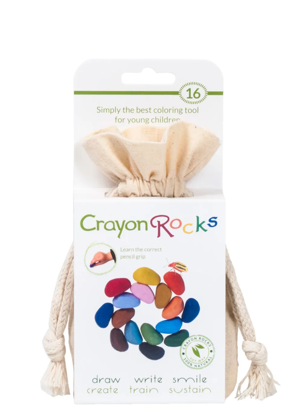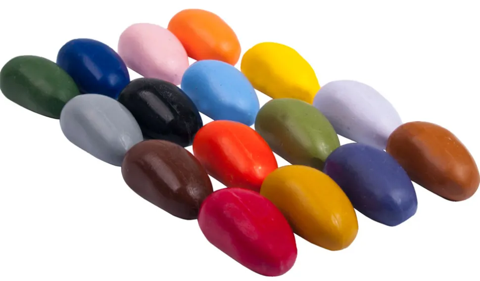 16 sojawas krijtjes in verschillende levendige kleuren. Speciaal ontwikkeld om jonge kinderen de pengreep aan te leren. Door de vorm worden kinderen gestimuleerd om de duim, wijs- en middelvinger te gebruiken tijdens het kleuren.