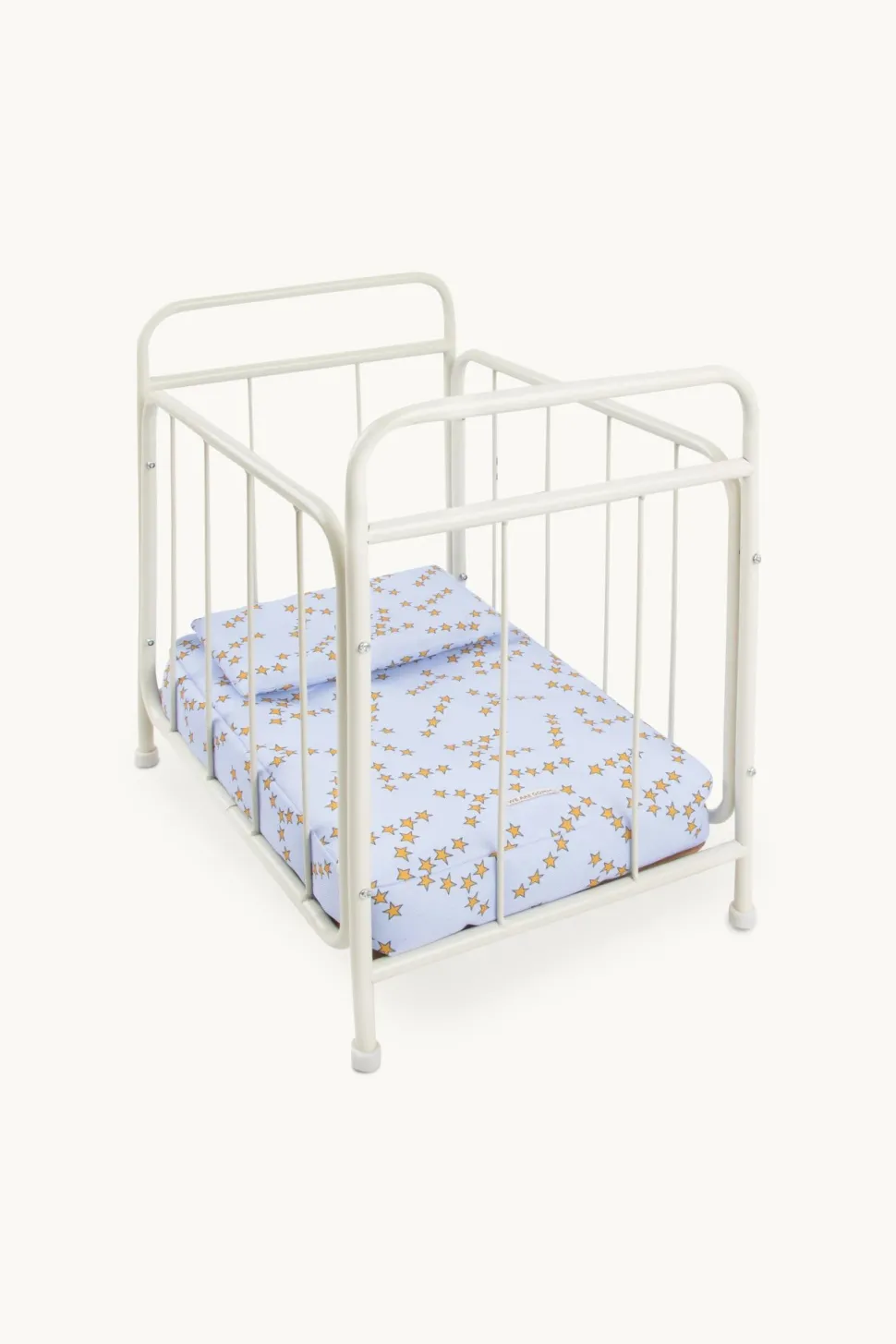 Het ledikant komt met een matras met sterretjesprint en bijpassend kussen.