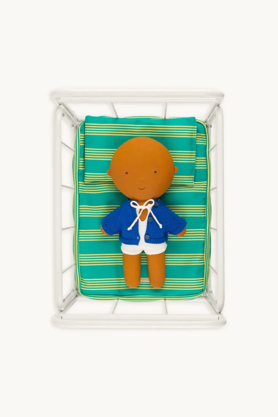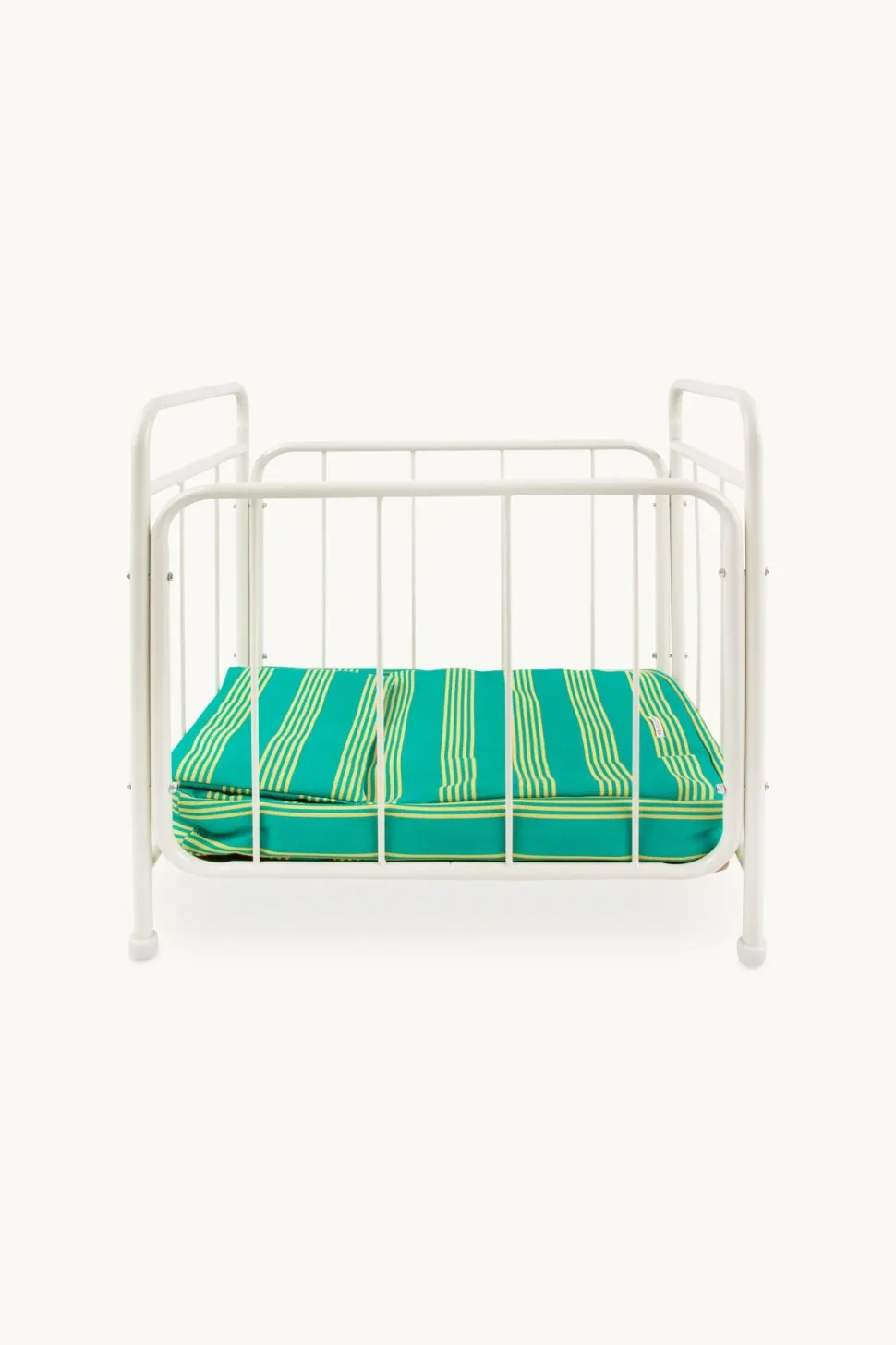 Het ledikant komt met een groen met geel gestreept matras en bijpassend kussen.