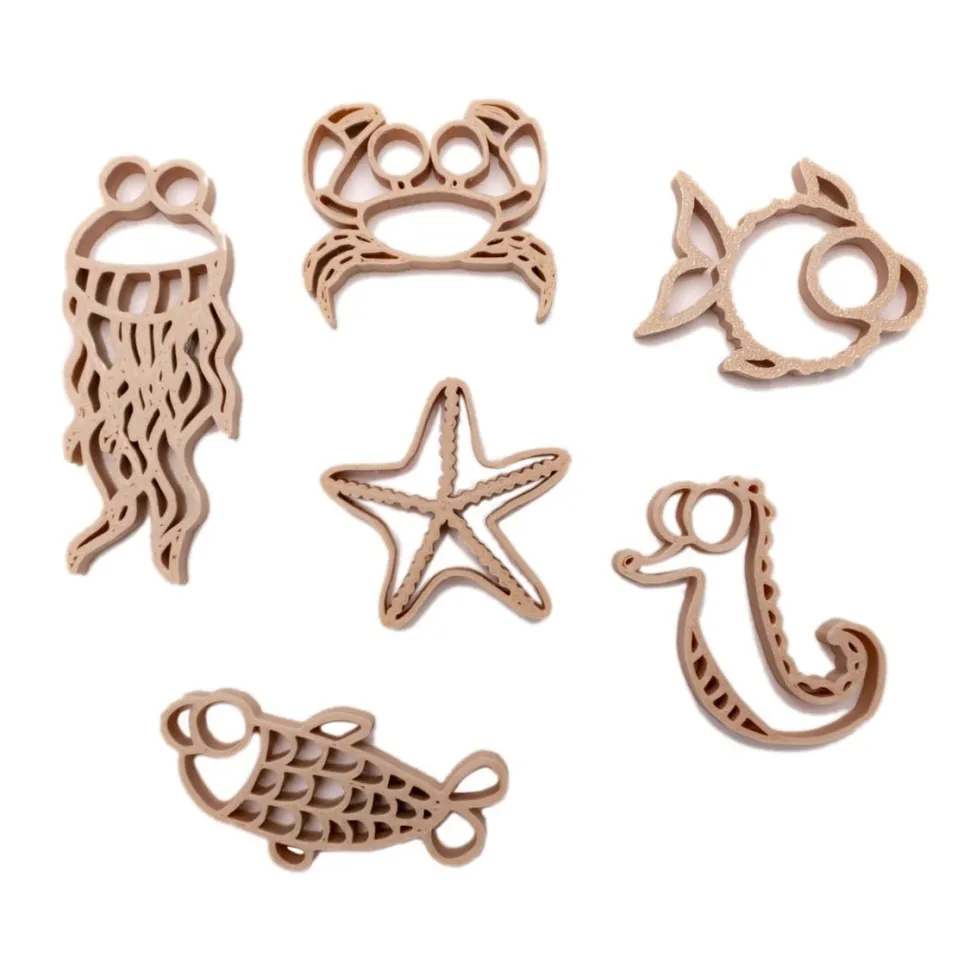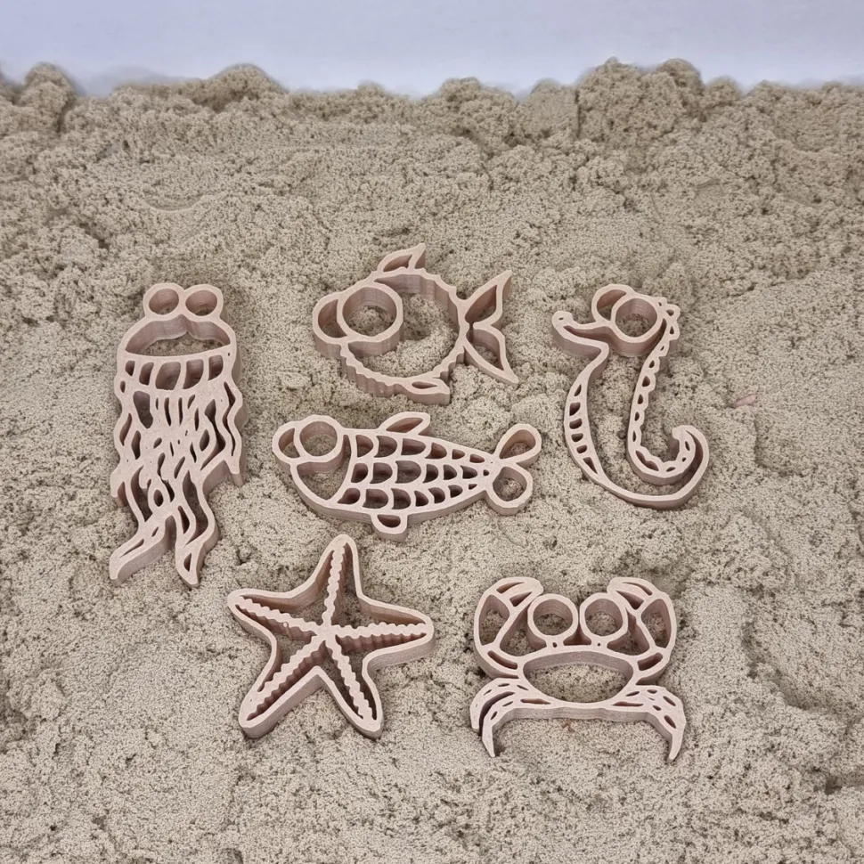Leuke uitstekers van een kwal, zeester, twee vissen, krab en een zeepaardje.