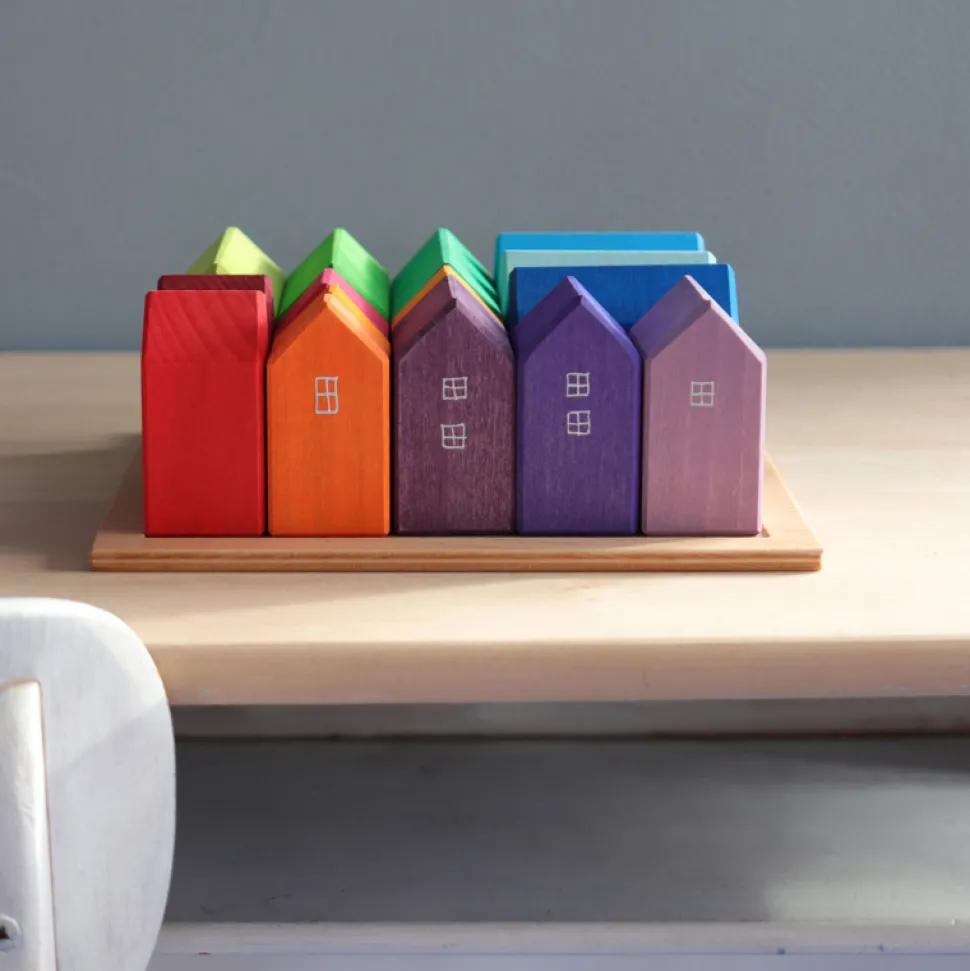 Mooie set van 15 huisjes in een houten frame. De huisjes kunnen heel gemakkelijk gestapeld worden, waardoor ze leuk zijn om mee te bouwen.