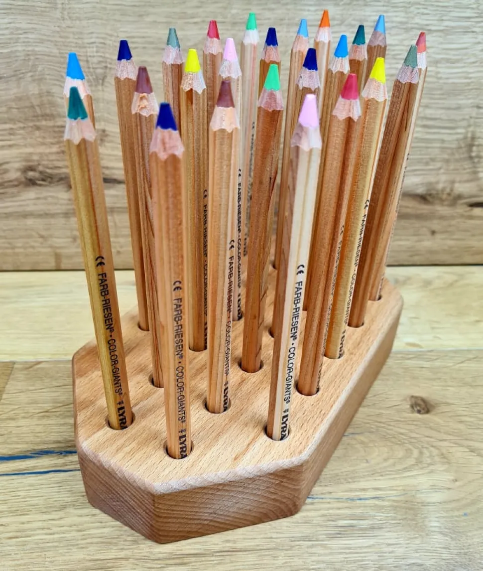Mooie potloodhouder met ruimte voor 24 potloden. In principe passen alle potloden er in, maar de houder is het meest geschikt voor iets dikkere potloden zoals de Lyra potloden.