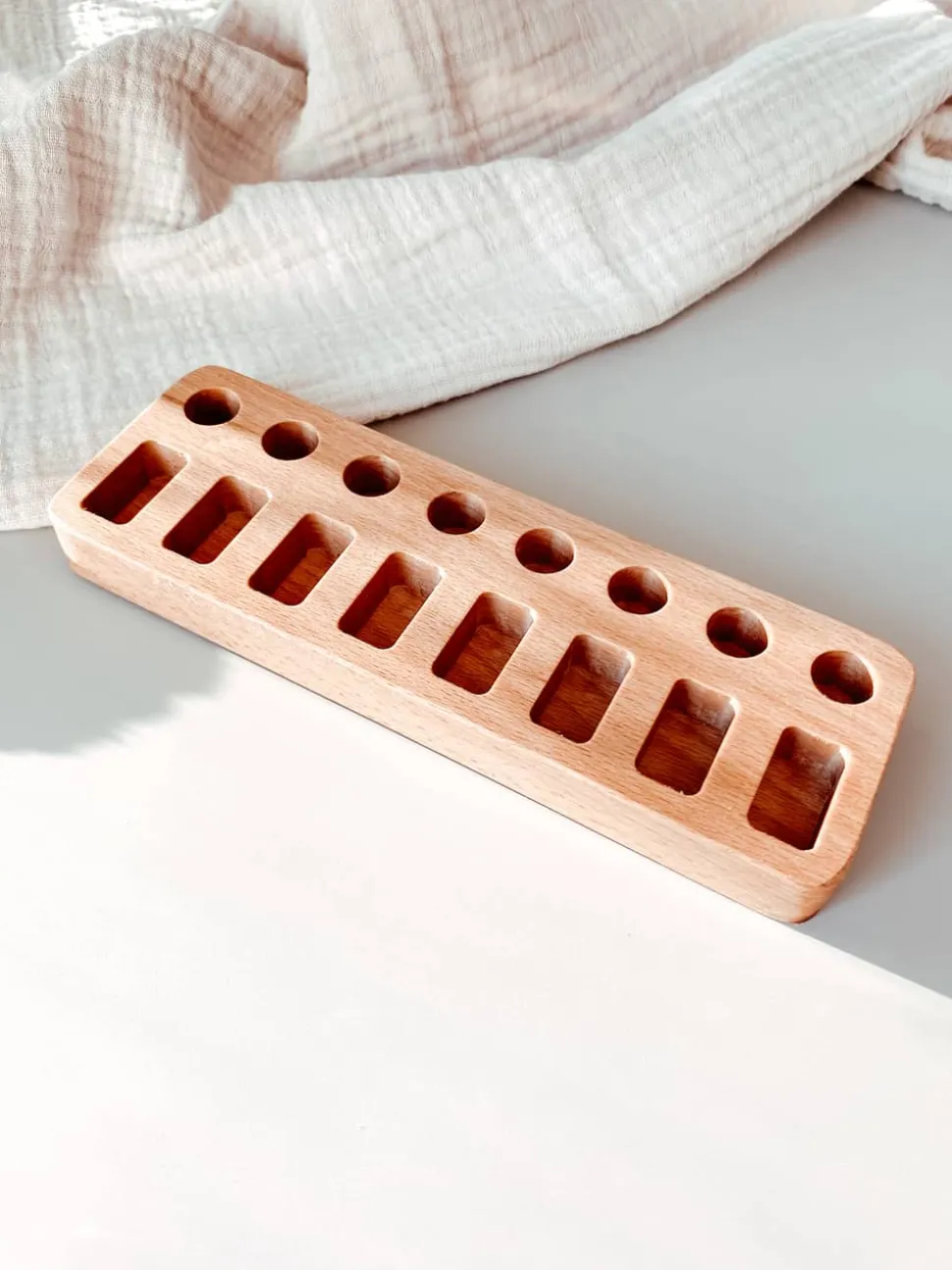 Prachtige massief beuken krijthouder waar elk Stockmar krijtje en blokje een perfect passend plekje heeft. In deze rechthoekige krijthouder is plek voor 8 ronde krijtjes en 8 blokkrijtjes.