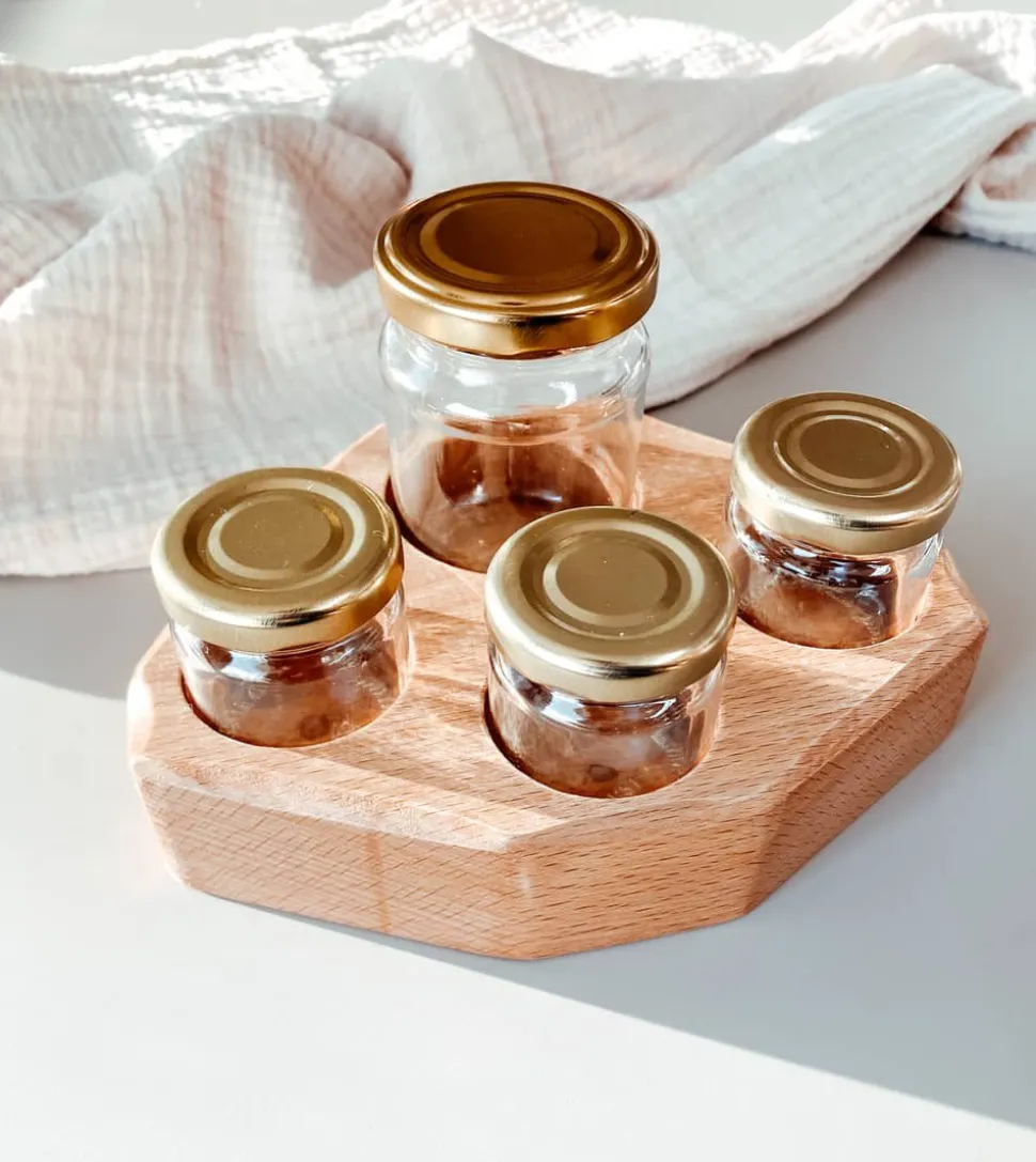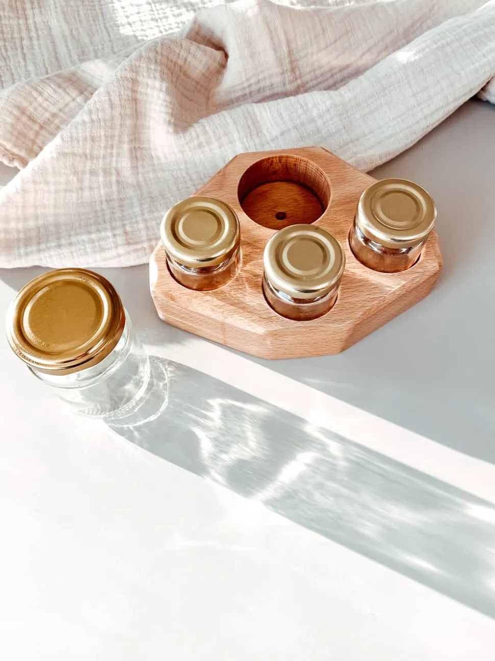 Een handgemaakte, organische verfhouder, voor drie kleuren verf en water.