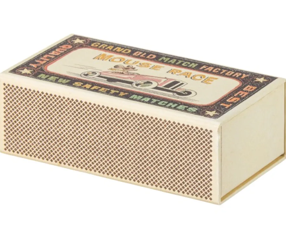 Lieve muis in een gestreepte nachtjapon met mooi bijpassend beddengoed in haar luciferdoosje.