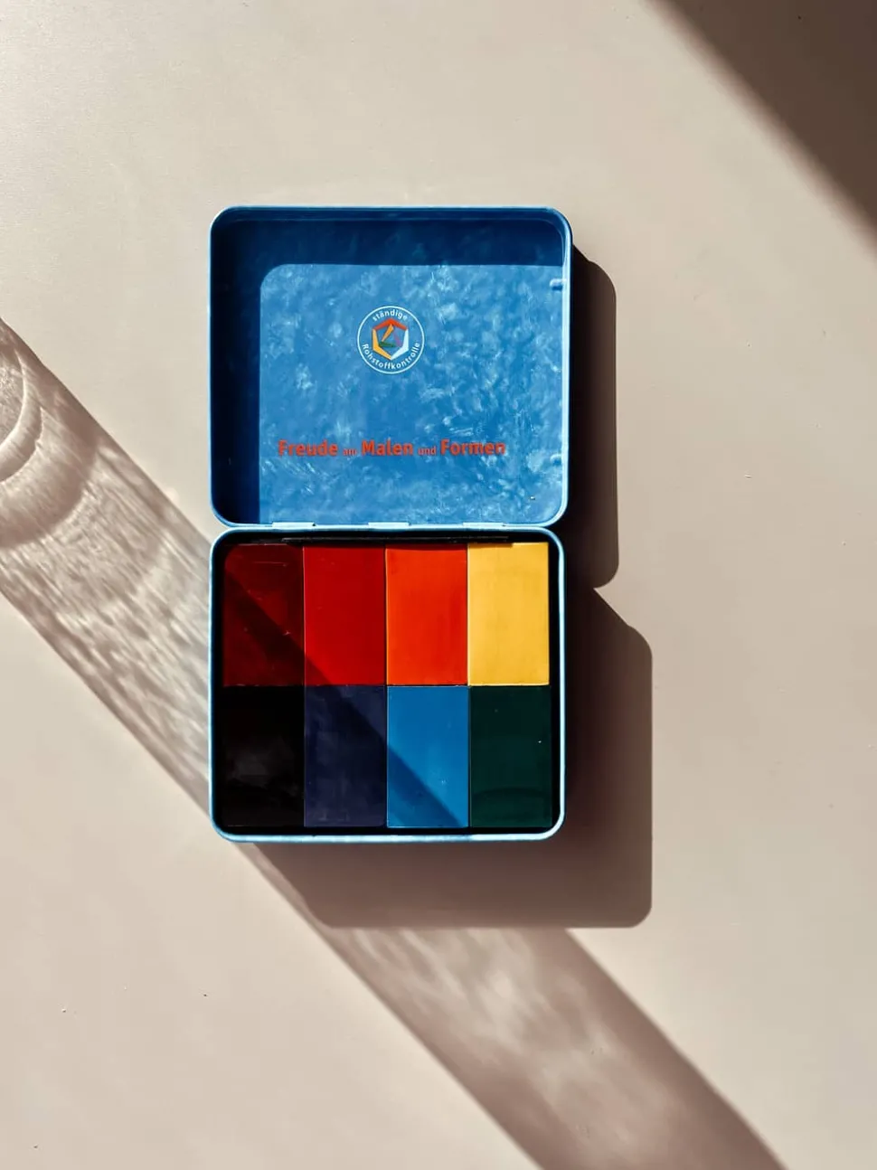 8 super mooi gekleurde rechthoekige waskrijtjes van het bekende merk Stockmar. De krijtes komen in een tinnen blikje.